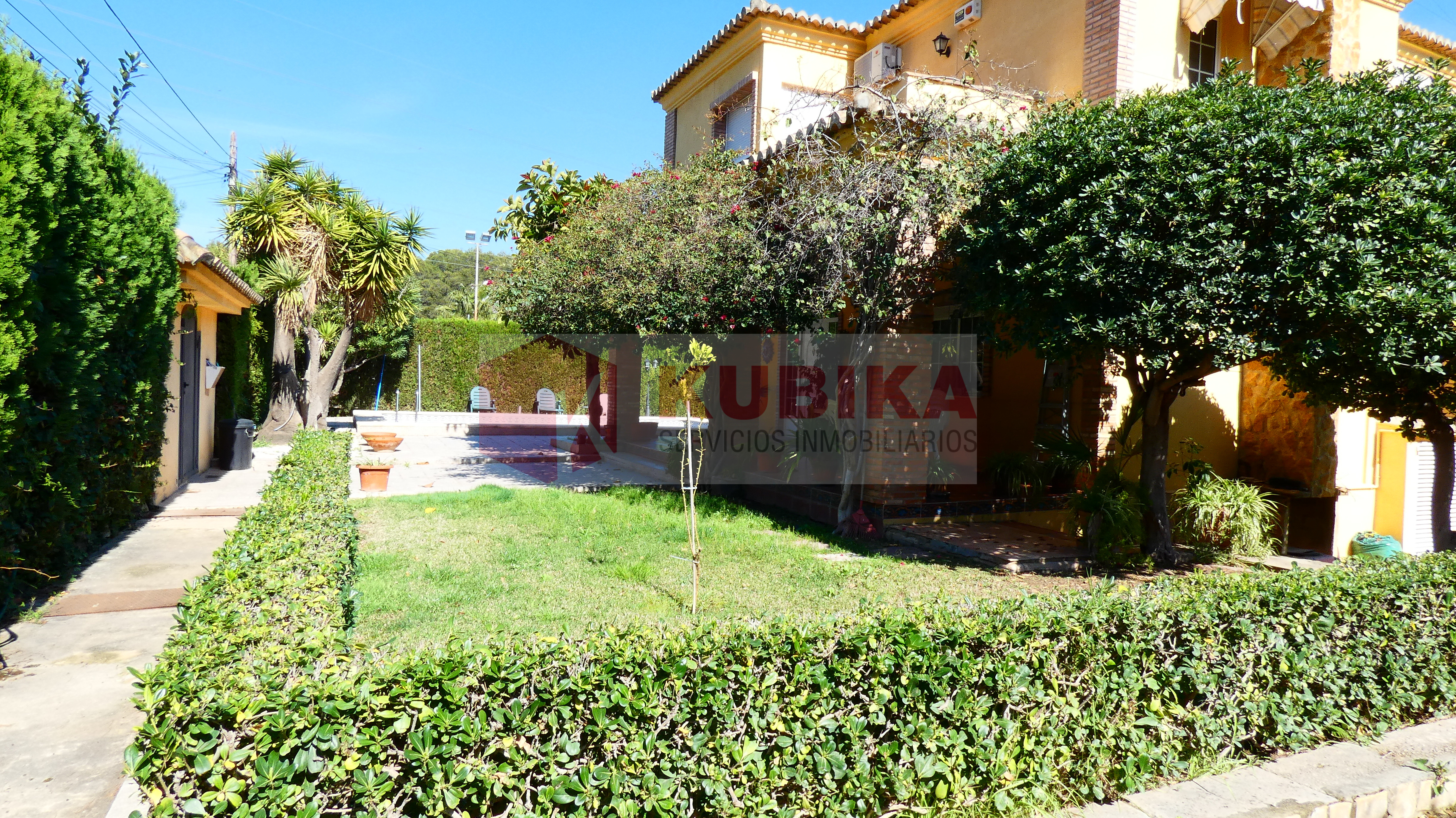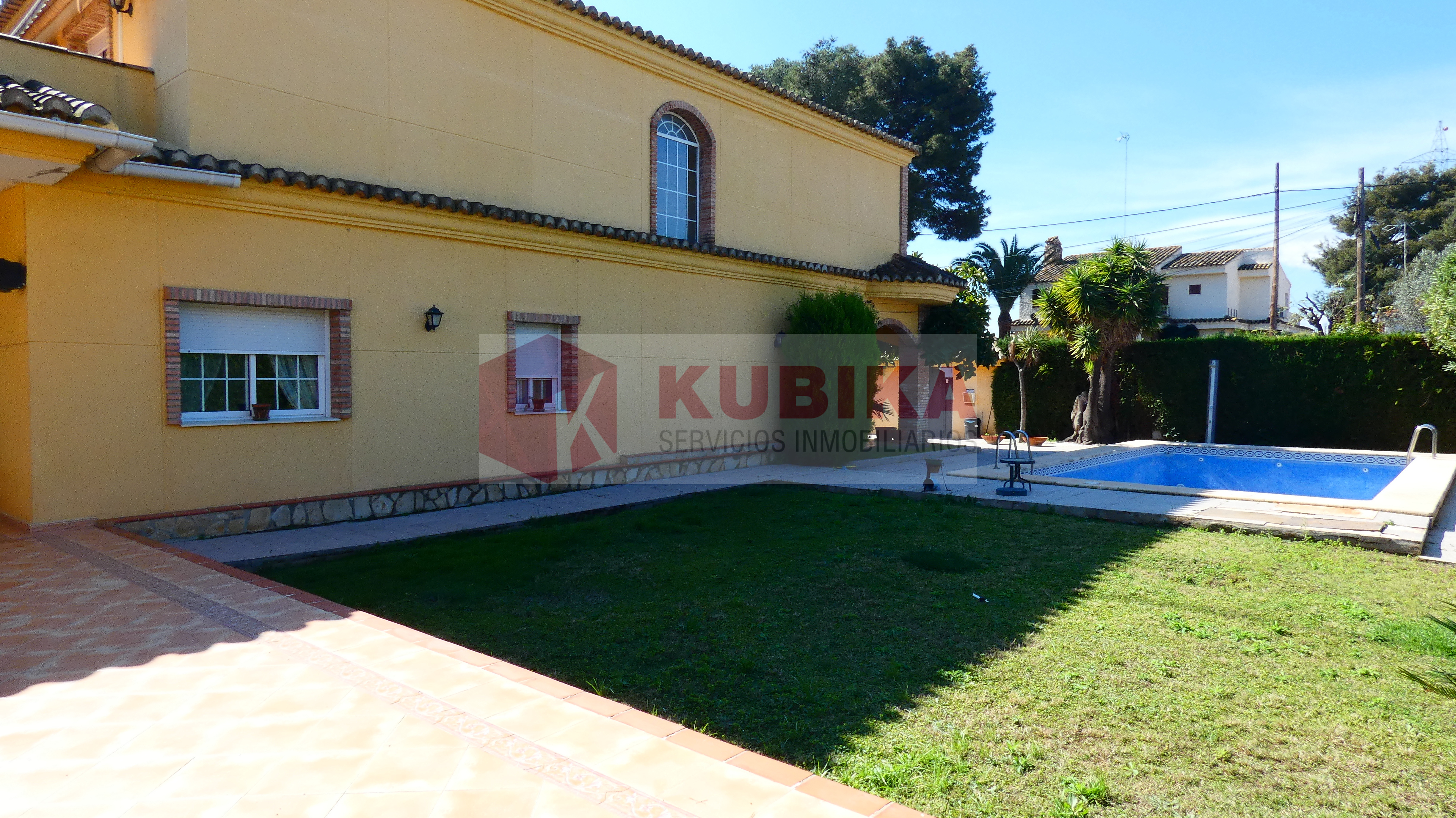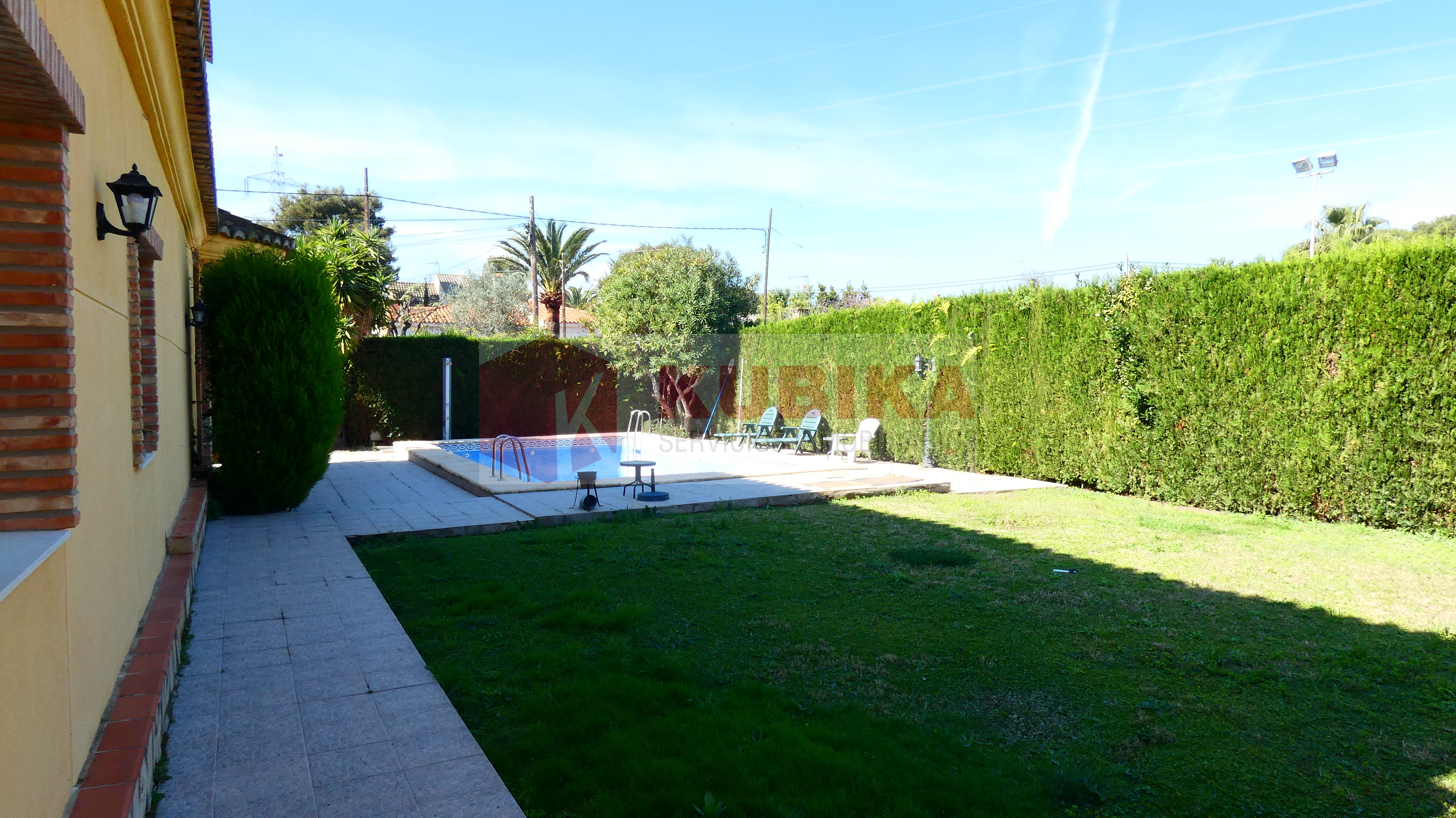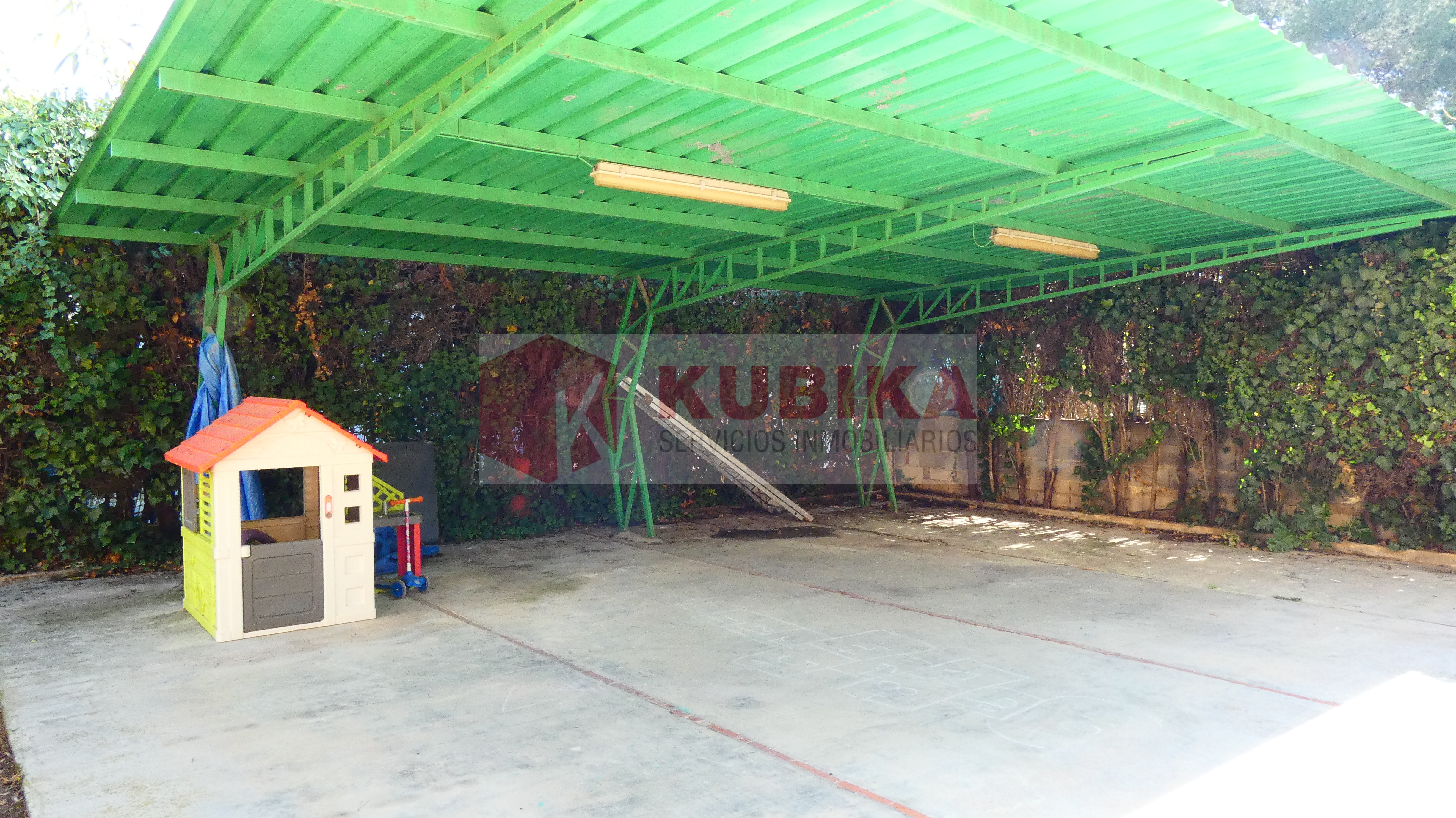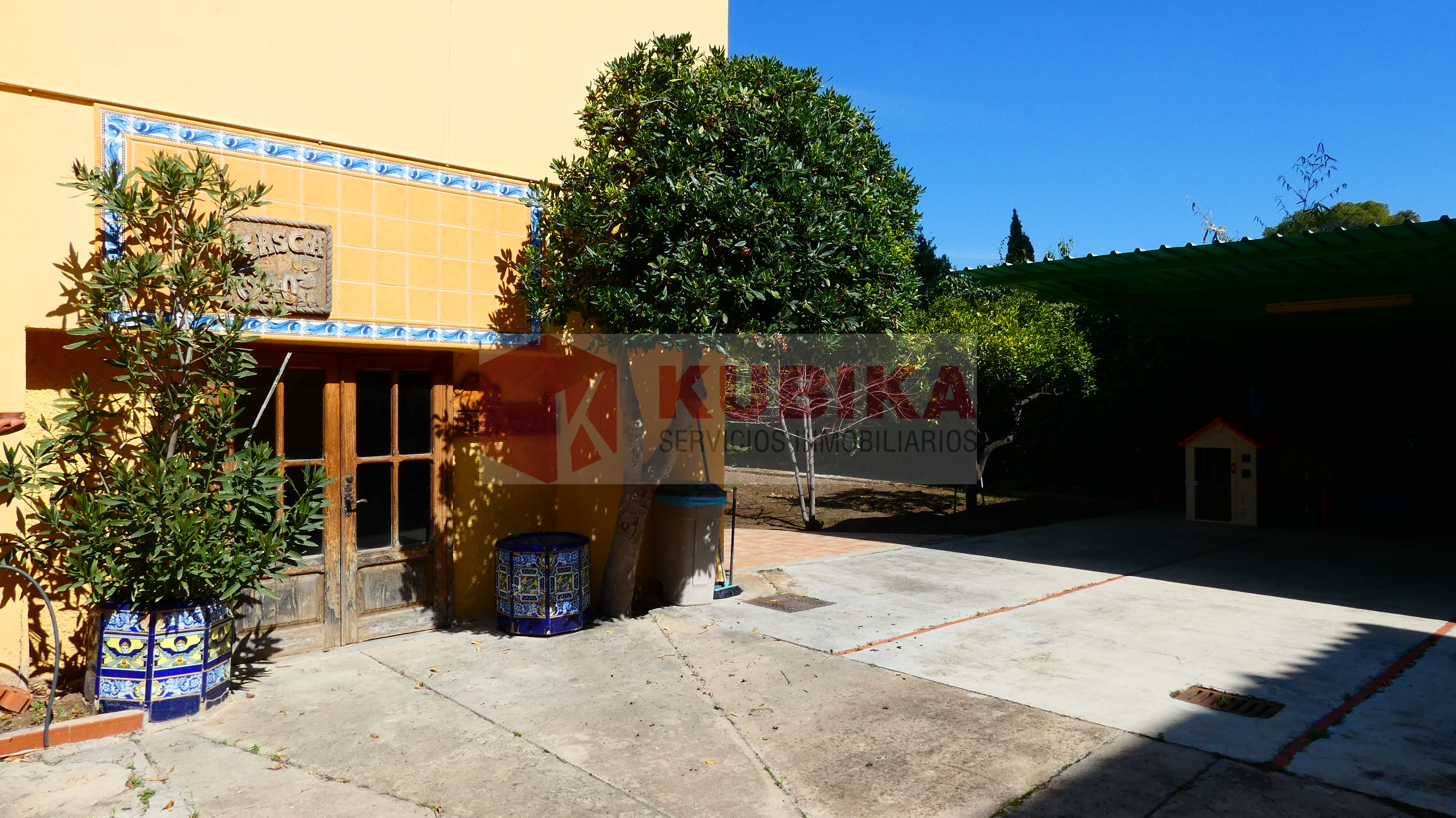 La vivienda dispone de un terreno de casi 1.100m2 con un jardín muy cuidado y totalmente consolidado, una bonita y amplia piscina de 9m x 5m, paellero, zona de árboles frutales, diversos espacios de almacenaje y una amplia cochera con puerta automática.