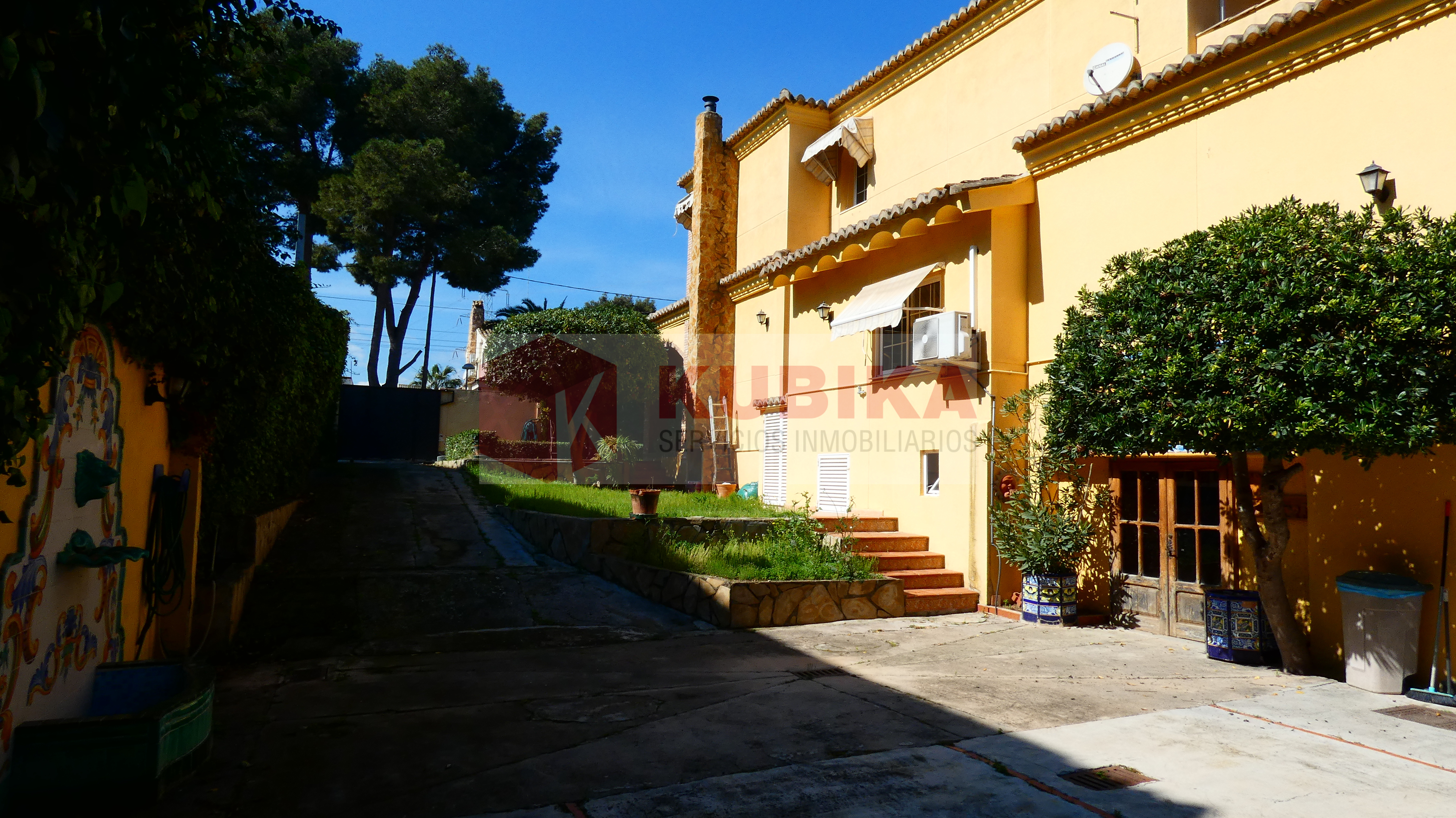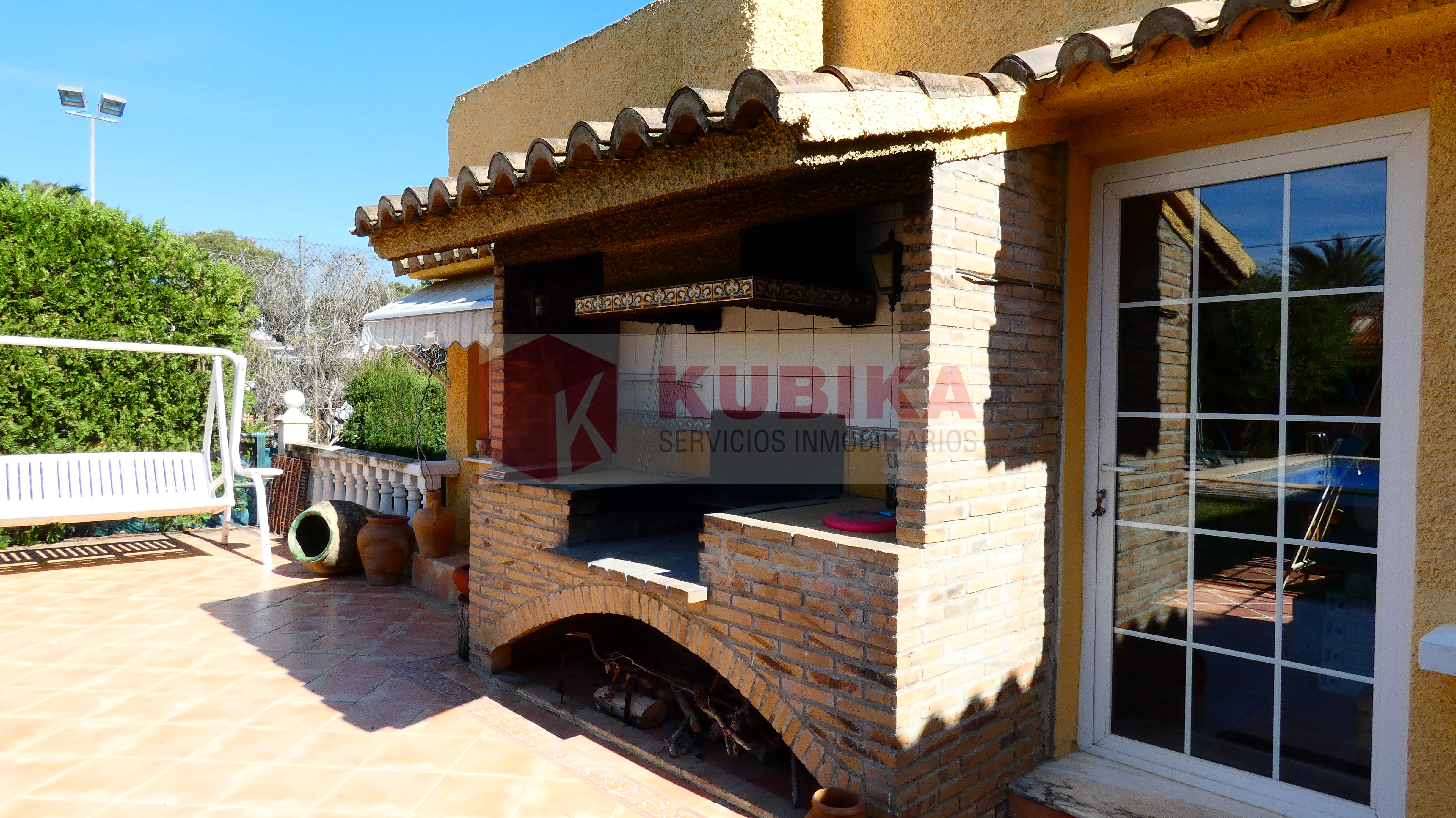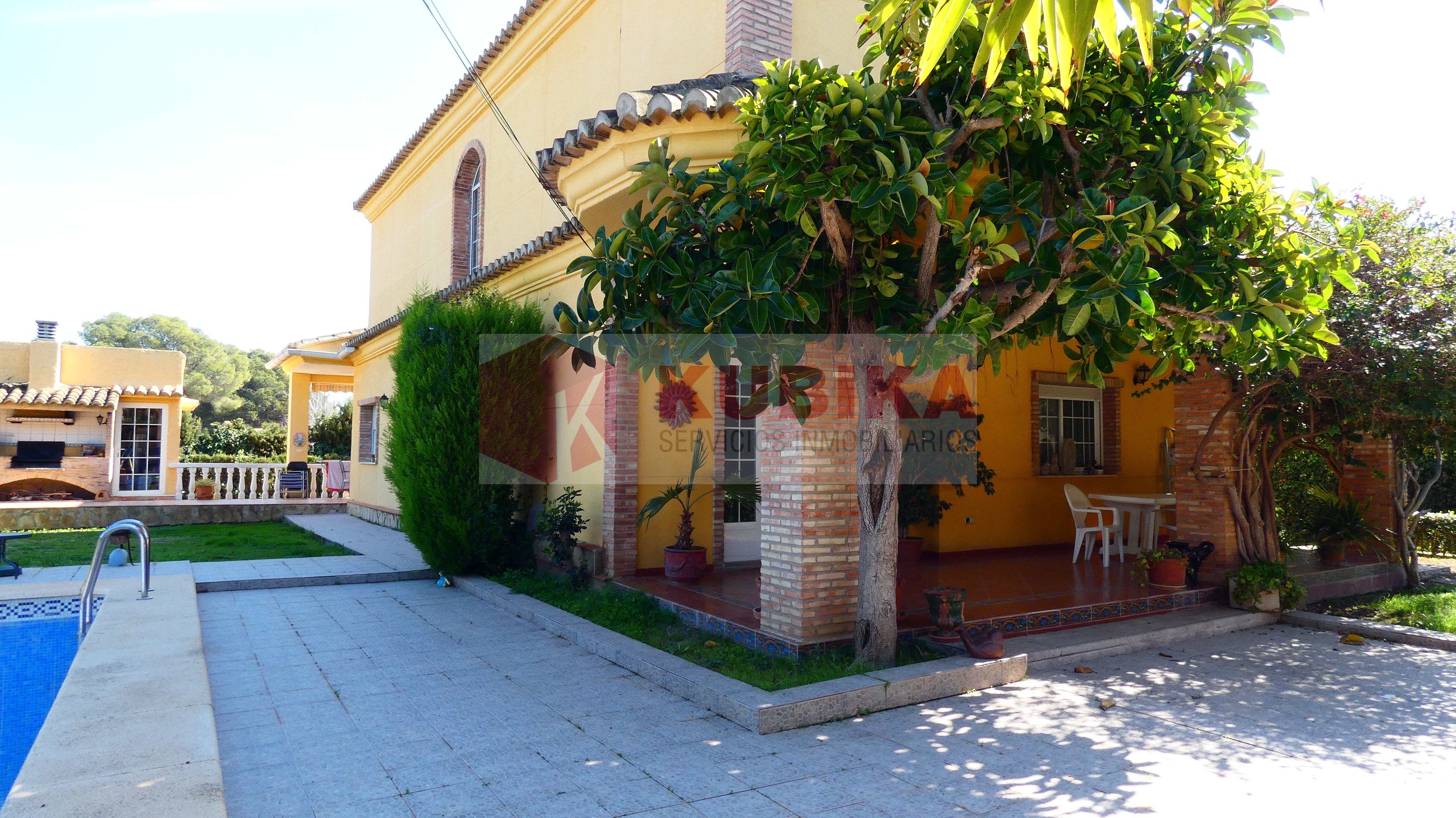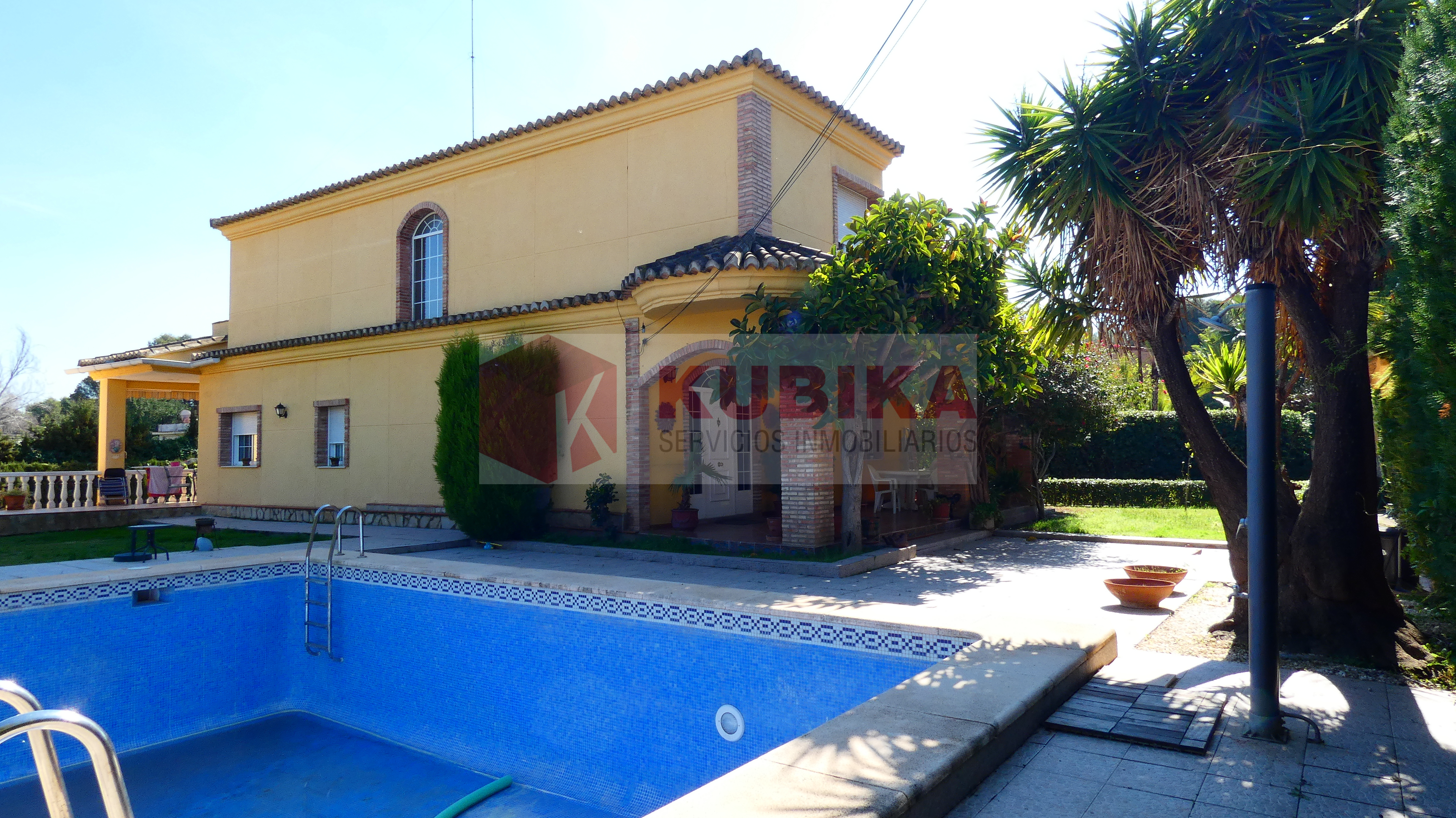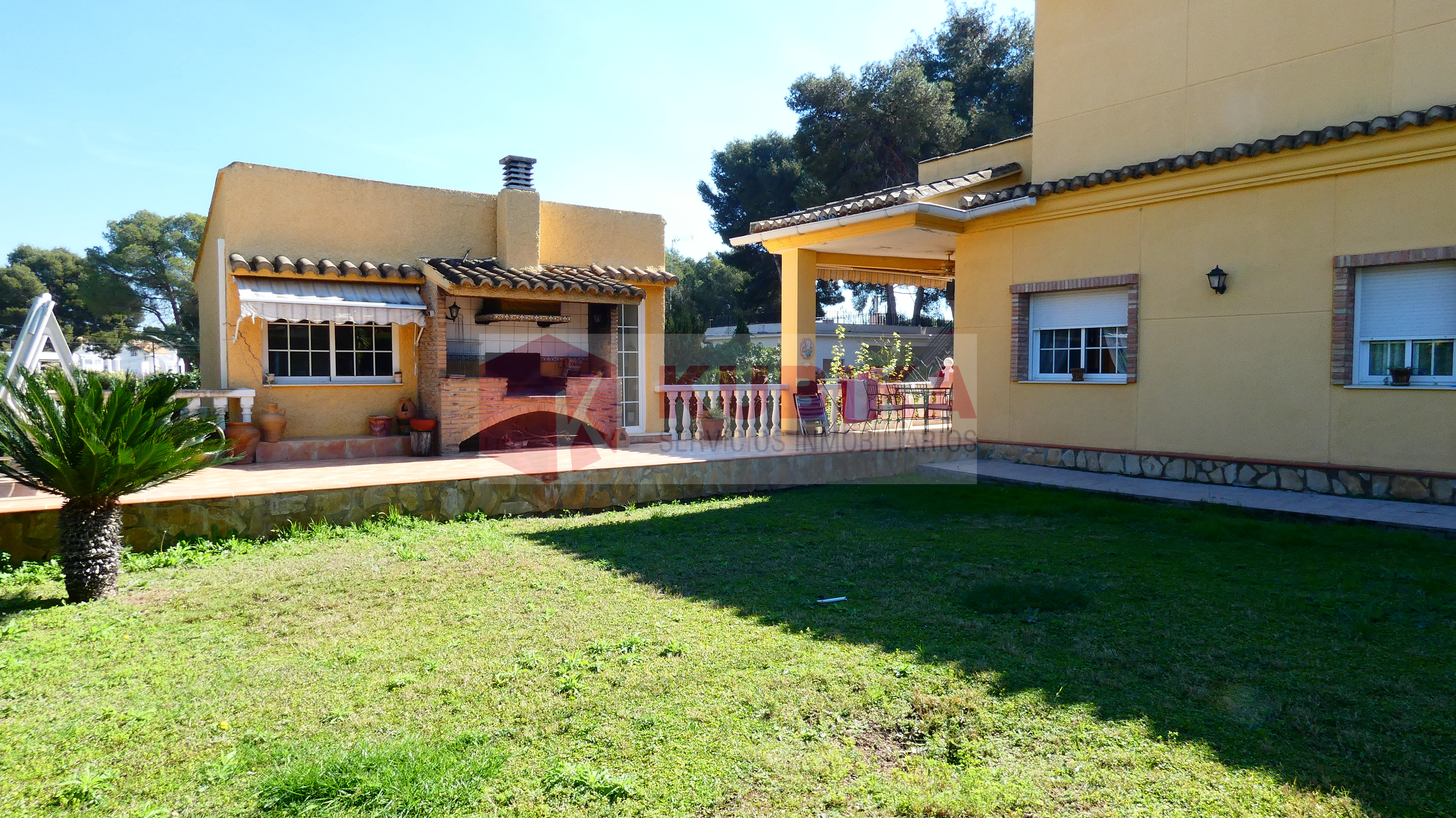 La vivienda dispone de un terreno de casi 1.100m2 con un jardín muy cuidado y totalmente consolidado, una bonita y amplia piscina de 9m x 5m, paellero, zona de árboles frutales, diversos espacios de almacenaje y una amplia cochera con puerta automática.